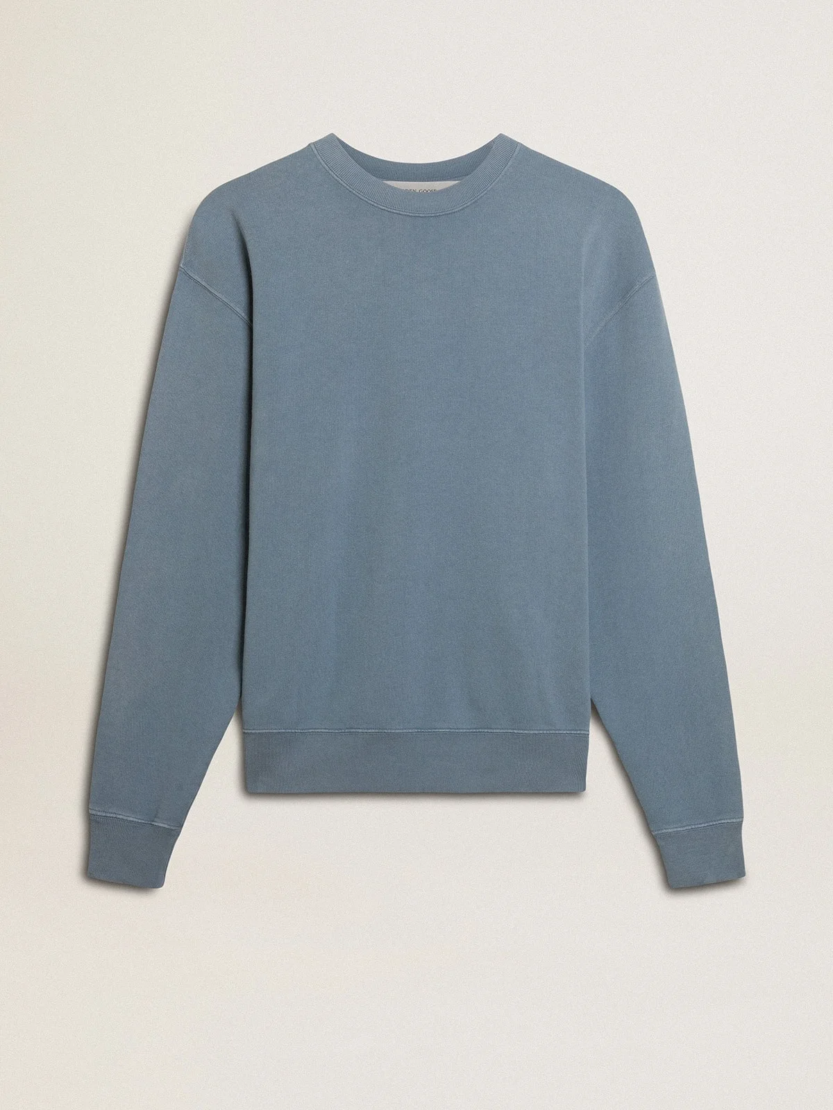 A unique, timeless collection that encapsulates the Golden Goose DNA, designed to remain with you every day, through thick and thin, come rain or shine. In baby blue cotton with a distressed finish, this sweatshirt features a raised reverse Golden logo on the back. DETAILS Item No. GUP01872.P001772.50813 - Color: baby blue - Reverse Golden logo on the back - Double silver star on the back - Relaxed fit - Long sleeves - Distressed finish - Main material: 100% cotton - Rib material: 100% cotton - Made in Italy The model is 183 cm tall and is wearing a size M.