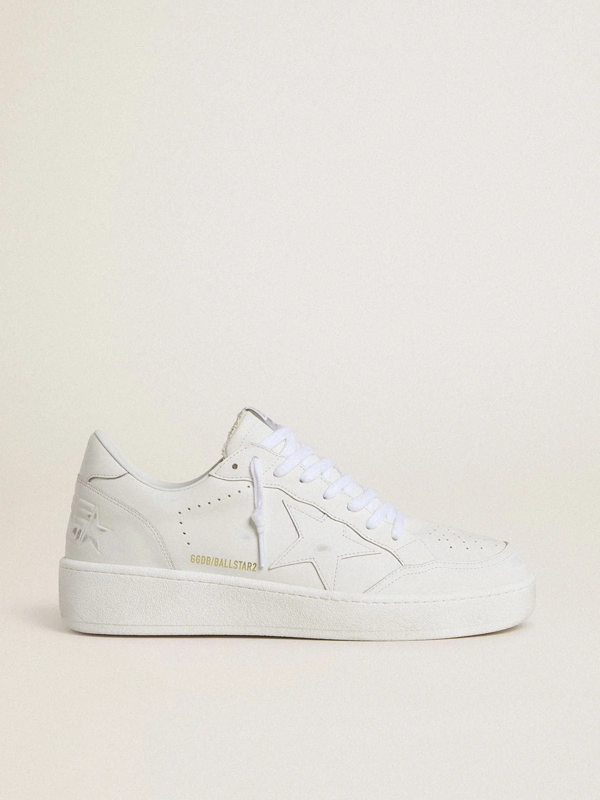 Dreaming of the Eighties. Our Ball Star sneakers have an American college vibe caught between a hoop shot and a skateboard ride. This model with a white leather upper features a white leather star and heel tab. And the white laces add the finishing touch: beautiful things that never go out of fashion. DETAILS Item No. GMF00804.F007322.10100 - White leather upper - White leather star - White leather heel tab - White laces - Vintage finish - Upper: 100% cow leather - Lining: 50% cow leather, 43% cotton, 5% polyester, 2% textile polyurethane - Sole: 100% rubber - Handmade - Made in Italy
