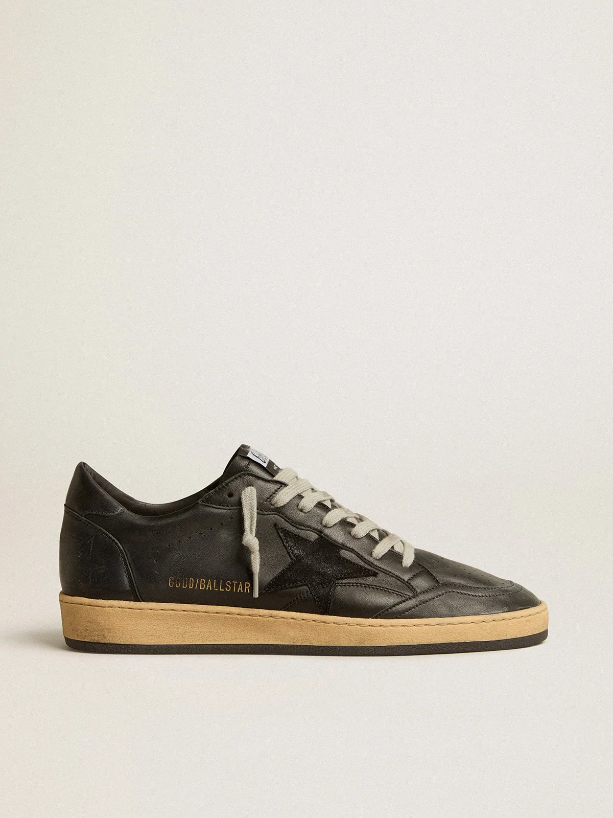 Dreaming of the Eighties. Our Ball Star sneakers have an American college vibe caught between a hoop shot and a skateboard ride. This model with a black nappa leather upper features a black suede star and a black nappa leather heel tab. And the ice-gray laces add the finishing touch: beautiful things that never go out of fashion. DETAILS Item No. GMF00117.F005243.90100 - Black nappa leather upper - Black suede star - Black nappa leather heel tab - Ice-gray laces - Black sole - Vintage finish - Upper: 97% sheepskin leather, 3% cow leather - Lining: 34% cotton, 31% cow leather, 23% textile polyurethane, 8% viscose, 4% polyester - Sole: 100% rubber - Handmade - Made in Italy