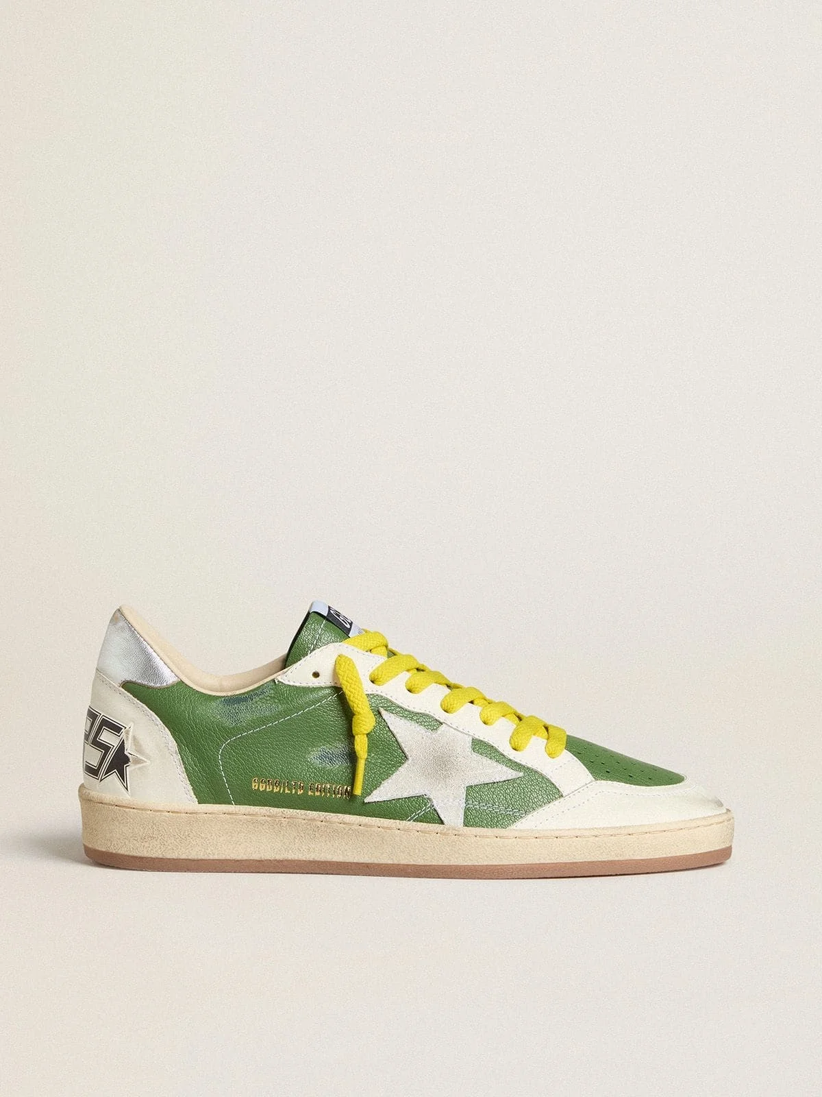 Dreaming of the Eighties. Our Ball Star sneakers have an American college vibe caught between a hoop shot and a skateboard ride. Like this model crafted in green nappa leather, featuring a white suede star and a silver metallic leather heel tab. The dirty-yellow laces and Sneakers lettering on the heel in a black heavy metal font add the finishing touch. DETAILS Item No. GMF00117.F007361.35837 - Green nappa leather upper - White suede star - Silver metallic leather heel tab - Sneakers lettering on the heel in a black heavy metal font - Yellow laces - Vintage finish - Upper: 91% sheepskin leather, 9% cow leather - Lining: 34% cotton, 31% cow leather, 24% textile polyurethane, 7% viscose, 4% polyester - Sole: 100% rubber - Handmade - Made in Italy