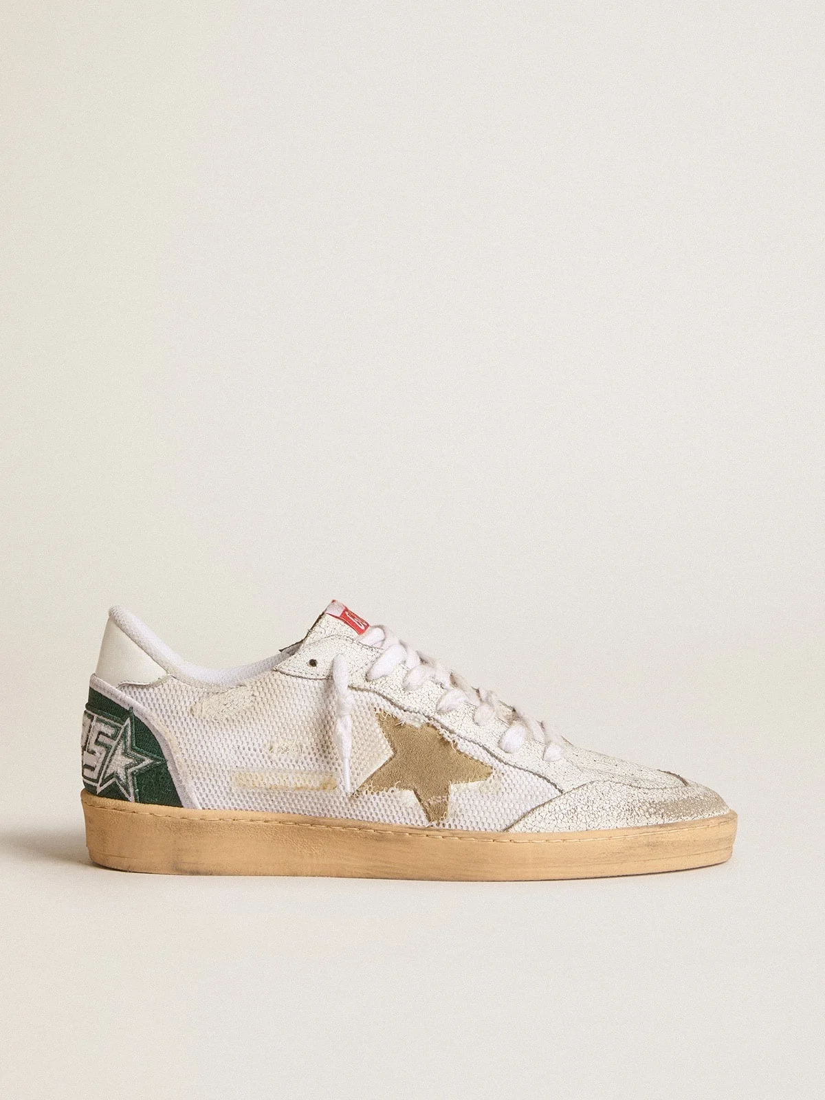 Dreaming of the Eighties. Our Ball Star sneakers have an American college vibe caught between a hoop shot and a skateboard ride. This model with a white crackle leather and mesh upper features a dove-gray suede star and a white leather heel tab. The green embroidered insert on the back and white laces add the finishing touch: beautiful things that never go out of fashion. DETAILS Item No. GMF00327.F006026.10502 - White crackle leather and mesh upper - Dove-gray suede star - White leather heel tab - Green embroidered insert on the back - White laces - Vintage finish - Upper: 66% cow leather, 24% polyamide, 10% spandex - Lining: 45% polyester, 27% cow leather, 26% cotton, 2% textile polyurethane - Sole: 100% rubber - Handmade - Made in Italy