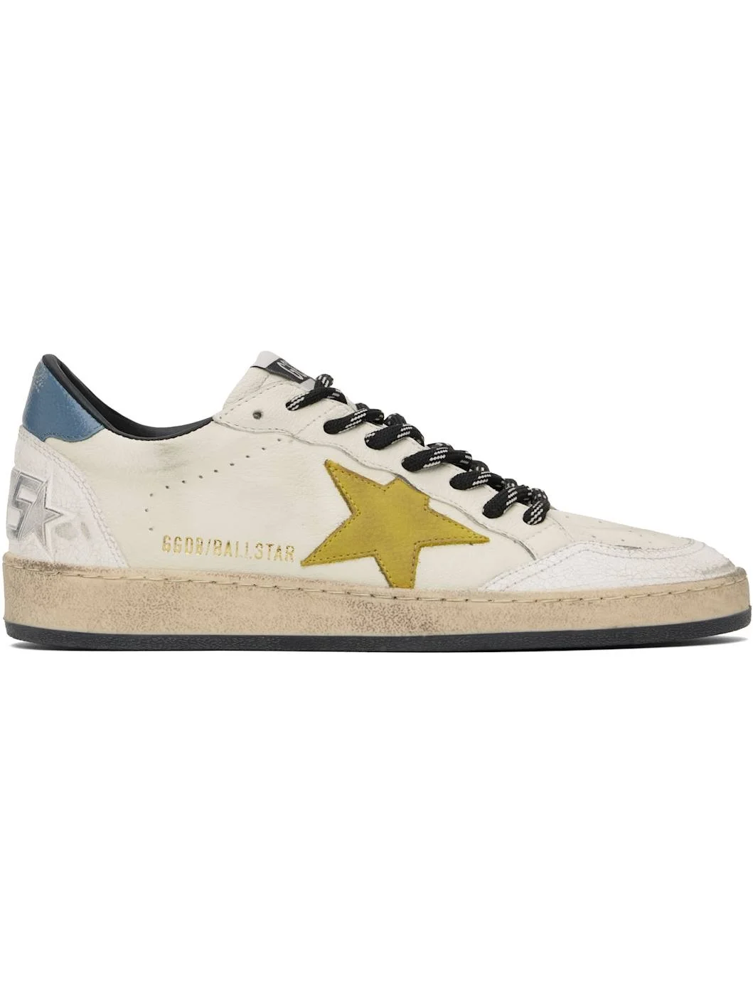 Low-top grained leather and nubuck sneakers in off-white, blue, and yellow. · Distressing, perforations, and smudging throughout · Lace-up closure · Logo patch at padded tongue · Padded collar · Signature star applique at outer side · Logo stamp at outer side · Text embossed at heel counter · Buffed leather, suede, and terrycloth lining · Textured rubber midsole · Treaded rubber sole Supplier color: White/Honey/Water blue Upper: leather. Sole: rubber. Made in Italy 251264M237057