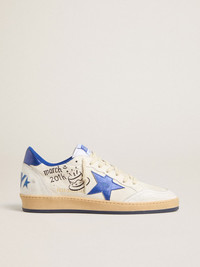 A sneaker designed to turn your special moments into unforgettable memories. Inspired by the 80s American college atmosphere, this Ball Star features the wording Happy Day in blue on the heel. This men’s model, with a white nappa leather upper, stands out owing to its bright blue laminated leather star and white crackle leather details, such as the toe and the insert on the back. DETAILS Item No. GMF00117.F005822.10793 - White nappa-leather upper - Blue Happy Day wording on the heel - Bright blue laminated leather star - Bright blue laminated leather heel tab - White crackle-leather inserts - White laces - Vintage finish - Upper: 56% sheepskin leather, 34% cow leather, 8% polyester, 2% nylon - Lining: 60% cotton, 40% cow leather - Sole: 100% rubber - Made in Italy