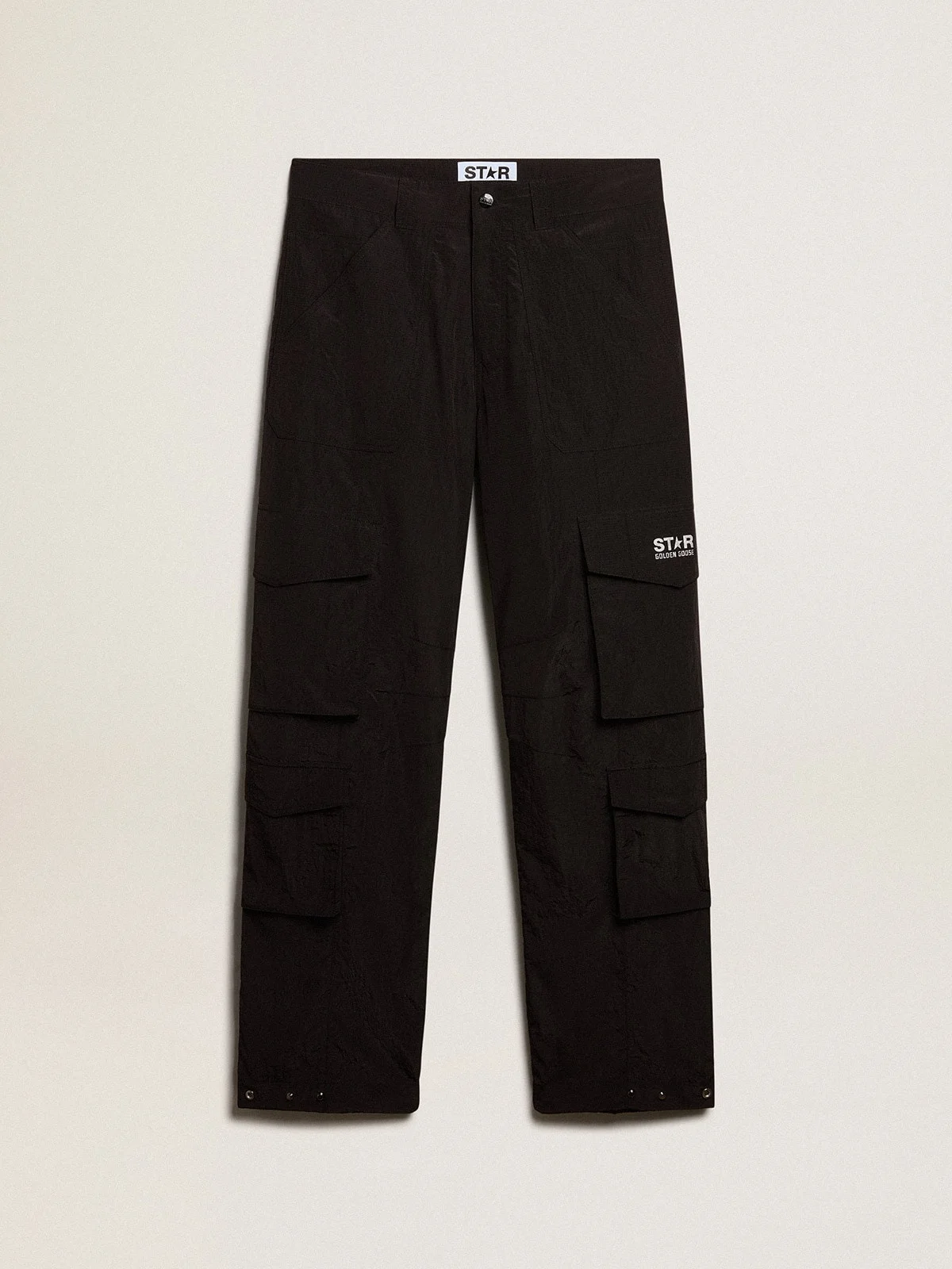 A collection with a casual soul but a versatile attitude: inspired by the Seventies, it has a timeless vintage appeal, suited to any occasion or look. These multi-pocket cargo pants in black ripstop nylon feature a button fastening that adjusts the width of the bottom hem. The white logo printed on the flap of the left knee patch pocket adds the finishing touch. DETAILS Item No. GMP01831.P001457.90100 - Star Collection - Color: black - Adjustable hems - Eight pockets - Printed logo - Regular fit - Main material: 100% nylon - Made in Italy The model is 183 cm tall and is wearing a size 48.