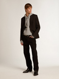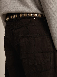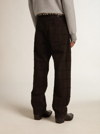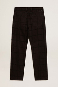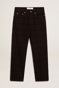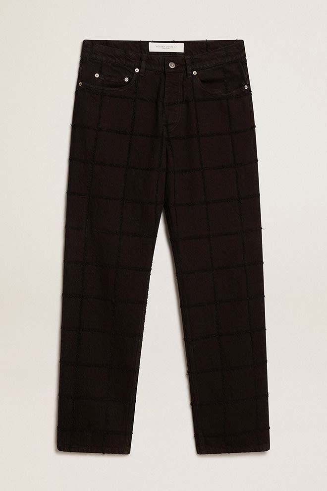An ode to Venice, our home, seen with the eyes of those dreamers who live it every day. This Journey Collection explores the city of our roots, drawing inspiration from the people who inhabit it. Different, iconic places now discovered through the life of its lovers. These black cotton denim pants inspired by the skating world feature an embroidered check pattern with a 3D effect and a wide leg. DETAILS Item No. GMP01636.P001265.90100 - Journey Collection - Color: black - Double star on the back - Five pockets - Button fastening - Wide leg - Loose fit - Main material: 100% cotton - Pocket lining: 65% polyester, 35% cotton - Made in Italy The model is 183 cm tall and is wearing a size 32 (IT).