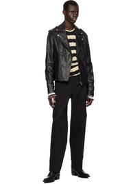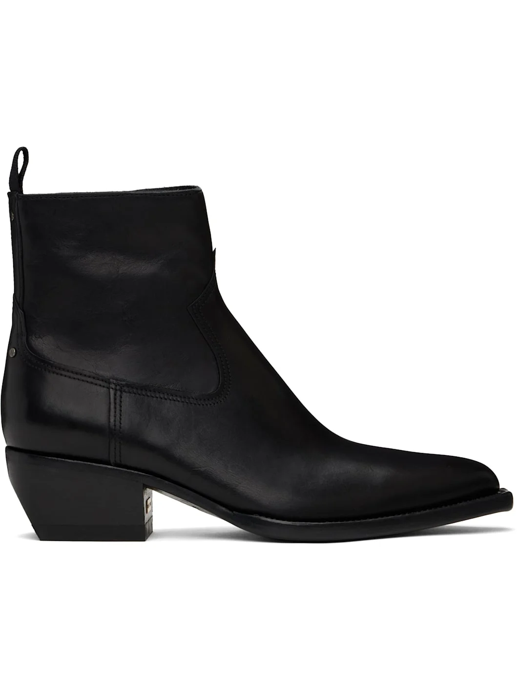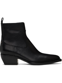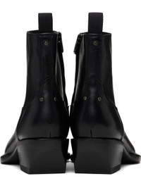Ankle-high paneled buffed and grained leather boots in black. · Pointed toe · Zip closure at inner side · Webbing pull-loop at heel collar · Studs at heel counter · Grained leather and suede lining · Topstitching at welt · Stacked leather block heel with rubber injection · Leather sole · Heel: H2.25" Supplier color: Black Upper: leather. Sole: leather, rubber. Made in Italy 251264M223000