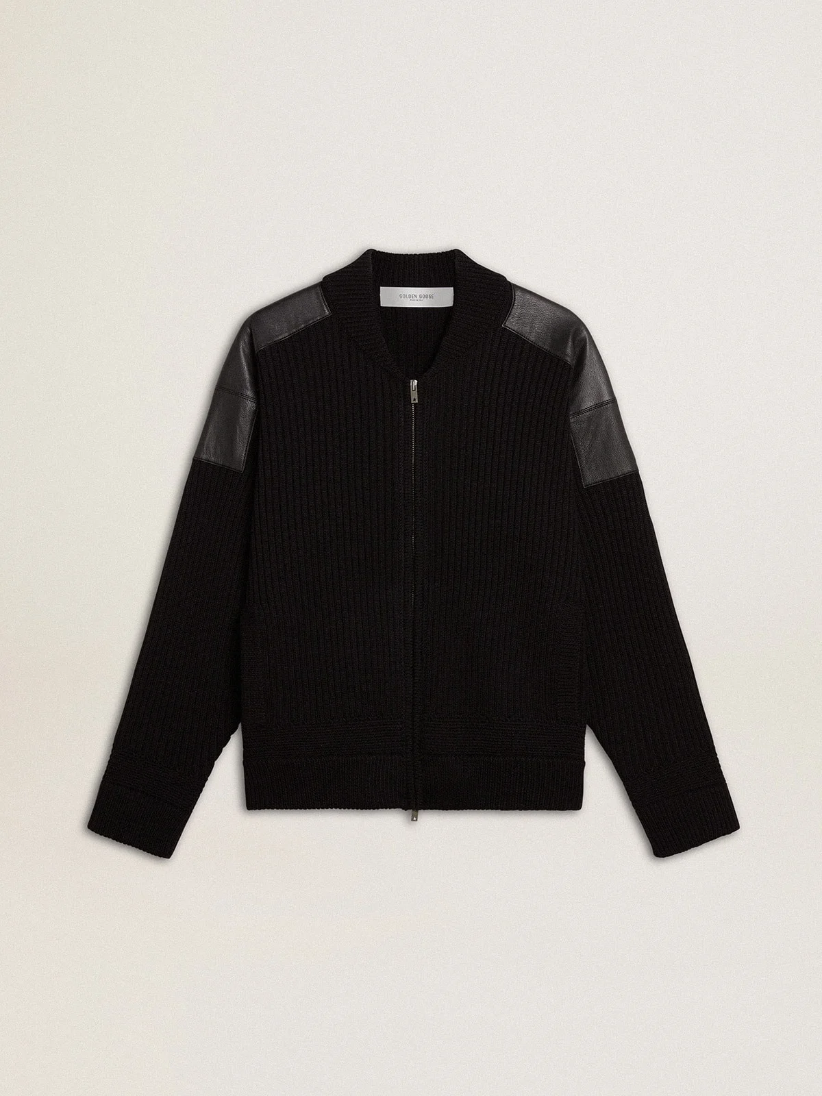 Inspired by the electric energy of the Nineties, the collection celebrates the limitless power of shared dreams. Moved by passion, each design captures the meaning of togetherness and the power of music. In merino wool, this black ribbed jacket with full zip features black leather patches on the shoulders and elbows. DETAILS Item No. GMP02102.P001829.90100 - Journey Collection - Color: black - Double star on the back - Leather patches on the shoulders and elbows - Full zip - Ribbed style - Main material: 96% wool, 3% polyamide, 1% spandex - Patch material: 100% sheepskin leather - Made in Italy The model is 183 cm tall and is wearing a size M.