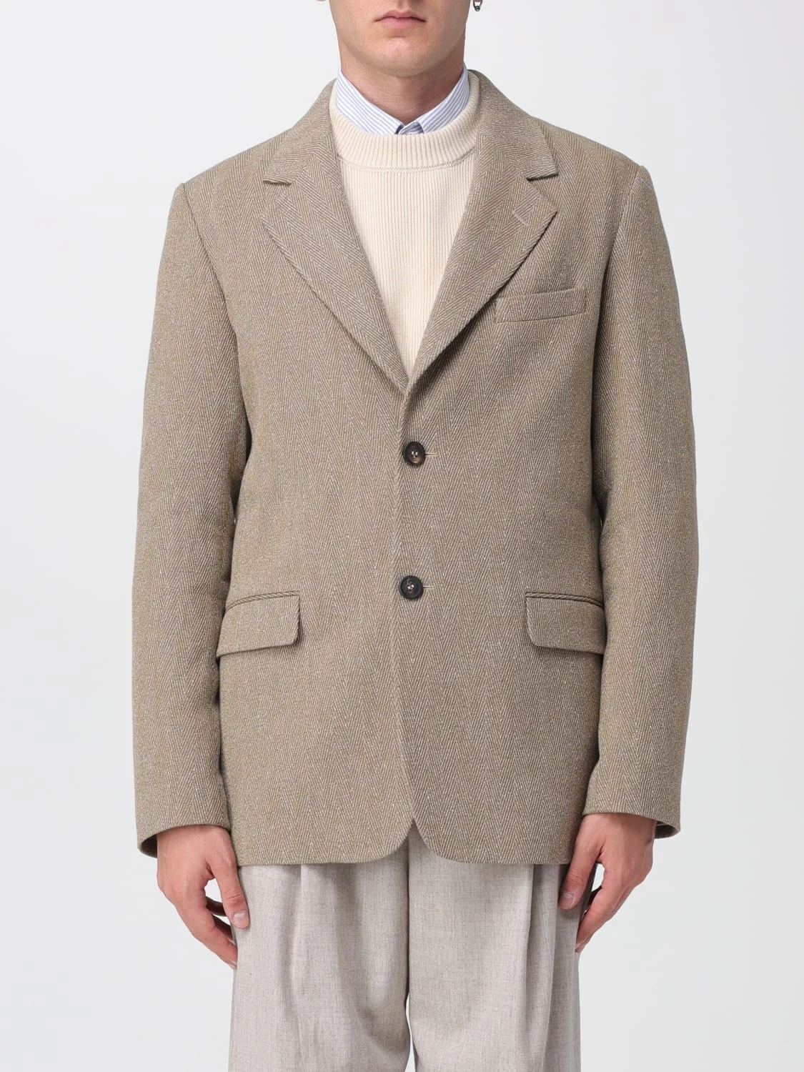 DESCRIPTION - Style: Classic, Elegant - Model: Single-breasted - Shoulders: Regular - Sleeves: Long - Bottom: With straight hemline - Neck: Lapel - Pockets: With flap - Closure: 2-button - Length: Short jackets - Materials: Cotton blend, Linen blend - Pattern: Chevron DETAILS AND CARE Composition 61% Linen, 38% Cotton, 1% Spandex; SIZE AND FIT Sizes not available Size and fit Regular fit Designer code: GMP02177P00208982971 Giglio Code: H33147 Designer: Golden Goose Collection: Golden Goose Men Category: Clothing Golden Goose