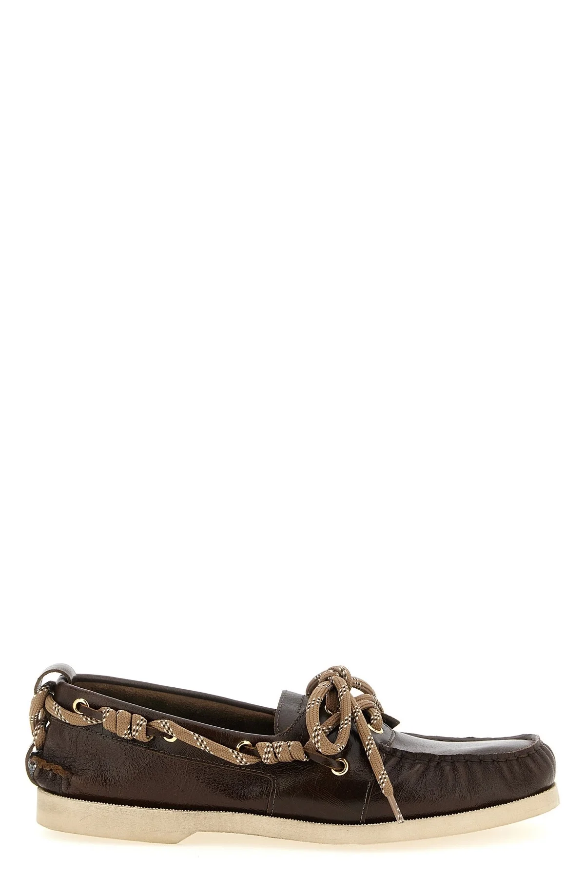 cod. GMF00883F0083185538155381 Leather boat loafers curled on the front, contrasting lace detail, rubber sole. Color: Brown Size & Fit: EU MEN Composition: 100% cow leather (Bos Taurus) Made in: Italy