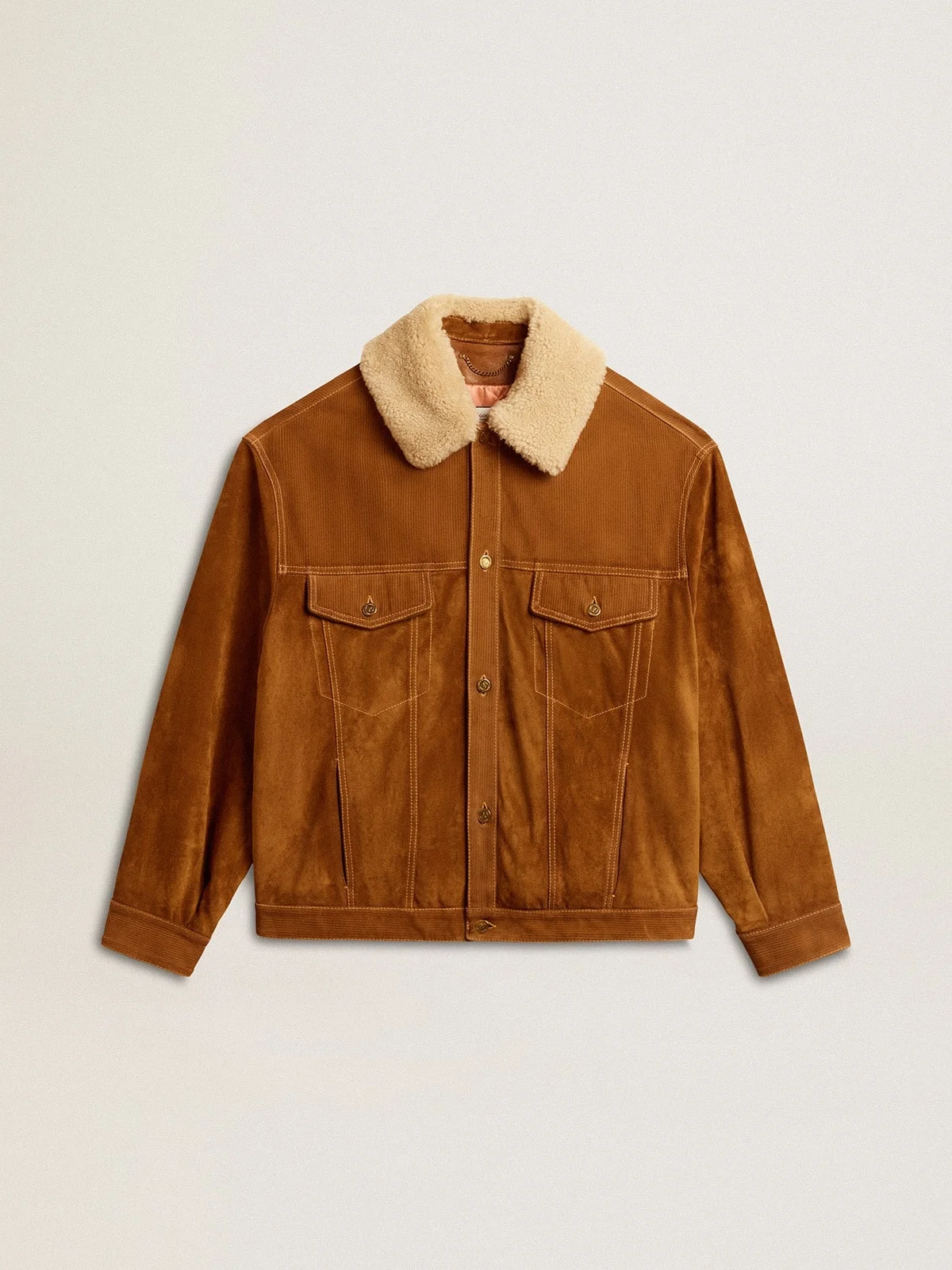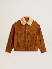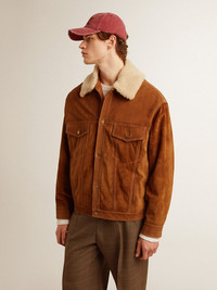 A love story to our home, Marghera. Where everything began. Our latest collection reflects the spirit of our birthplace, its contrasts, industrial soul, and manufacturing landscapes, weaving together inspirations from both the vibrant energy of workwear and the refined essence of traditional tailoring. This men's jacket in split leather with corduroy-effect laser detailing features a detachable collar in shearling merino wool. The lightly padded quilted lining with logo adds the finishing touch. DETAILS Item No. GMP02039.P001671.55194 - Journey Collection - Color: tobacco - Double star on the back - Regular fit - Four front pockets - Detachable shearling collar - Quilted and slightly padded lining with logo - Antique gold button fastening - Main material: 100% cow leather - Contrasting material: 100% cow leather - Padding: 100% polyester - Collar material: 100% sheepskin leather - Lining material: 100% viscose - Pocket lining: 100% cotton - Made in Italy The model is 183 cm tall and is wearing a size 48.