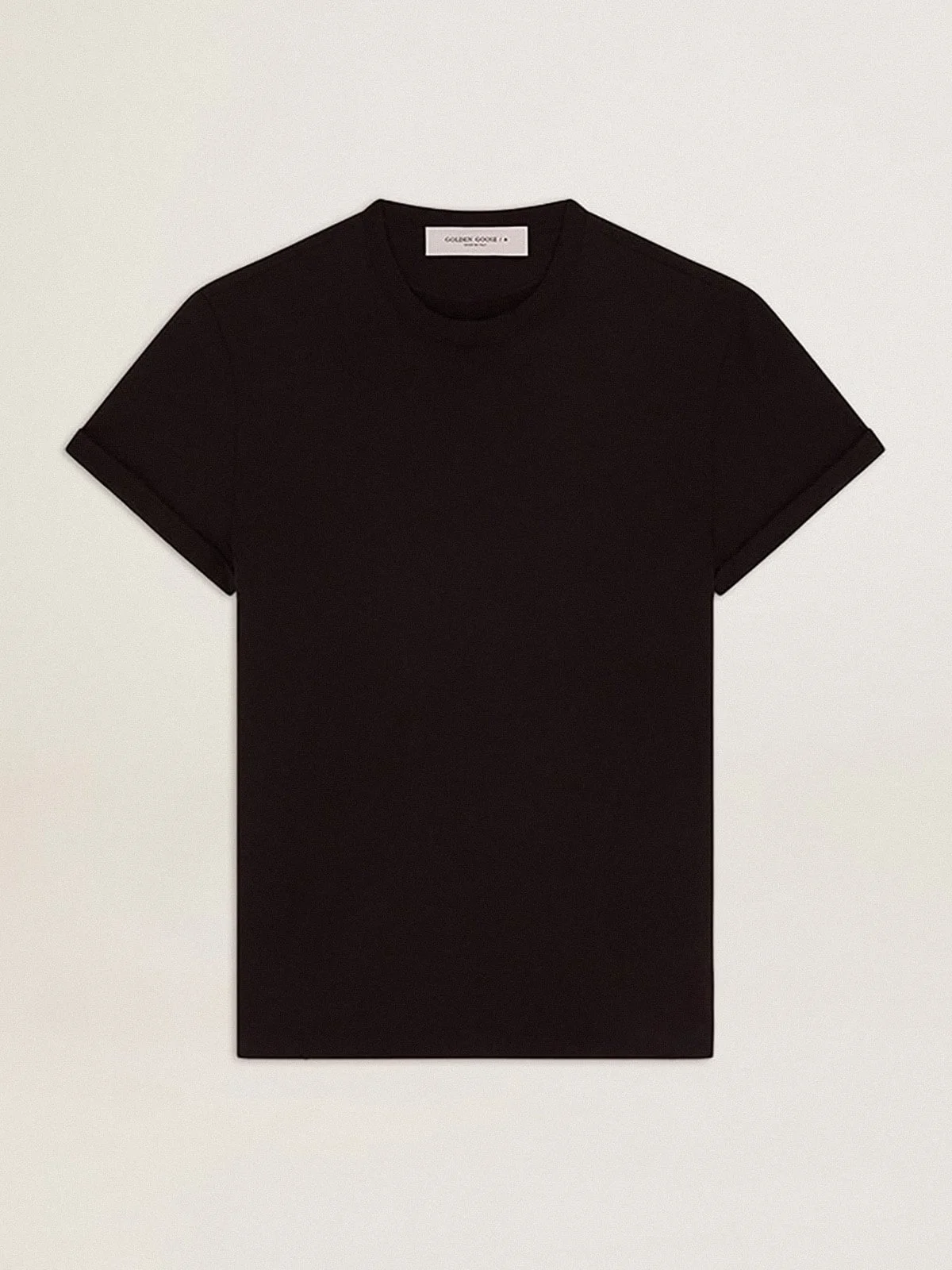 A unique, timeless collection that encapsulates the Golden Goose DNA, designed to remain with you every day, through thick and thin, come rain or shine. In distressed vintage black cotton, this regular fit T-shirt features a detachable white patch with a finely embroidered red letter G and the double gold star on the back. DETAILS Item No. GMP01220.P000637.90292 - Color: vintage black - Double gold star on the back - Detachable white patch with embroidered red letter G - Regular fit - Short sleeves - Distressed treatment - Main material: 100% cotton - Made in Italy The model is 183 cm tall and is wearing a size M.