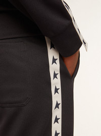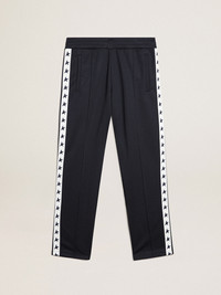 A collection with a casual soul but a versatile attitude: inspired by the Seventies, it has a timeless vintage appeal, suited to any occasion or look. Inspired by the world of tailoring, echoed by the stitched pleat on the front, these joggers in dark blue technical jersey feature a regular leg. The white grosgrain strip on the sides of the legs with contrasting blue stars adds the finishing touch. DETAILS Item No. GMP00877.P000521.50767 - Star Collection - Color: dark blue - White grosgrain strip on the sides with contrasting blue stars - Three pockets - Regular leg - Main material: 100% polyester - Pocket lining: 100% cotton The model is 183 cm tall and is wearing a size M.