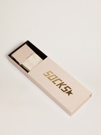 The must-have accessory for a total Golden look. These papyrus-white socks feature a deep welt with distressed finish and baby-pink striped logo. DETAILS Item No. GUP00883.P000487.81698 - Color: papyrus white - Baby-pink logo and stripes - Distressed-finish deep welt - Main material: 70% cotton, 27% polyamide, 3% spandex - Made in Italy Size S corresponds to 35-39