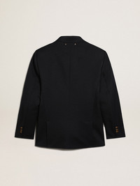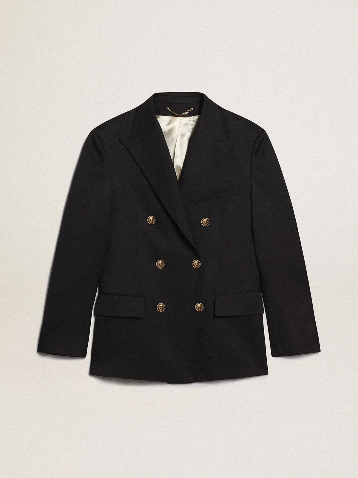 A unique, timeless collection that encompasses the essence of Golden Goose, designed to remain with you every day and accompany your highs and lows, come rain or shine. This regular-fit double-breasted blazer in dark blue features a fastening with gold-colored heraldic buttons and a detachable white patch with a finely embroidered letter G in red. DETAILS Item No. GMP00835.P000619.50486 - Color: dark blue - Double-breasted model - Double gold star on the back - Detachable white patch with embroidered red letter G - Regular fit - Three front pockets - Long sleeves - Fastening with gold-colored heraldic buttons - Main material: 66% polyester, 34% virgin wool - Lining: 64% viscose, 36% rayon - Sleeve lining: 52% viscose, 48% acetate - Made in Italy The model is 183 cm tall and is wearing a size 48.