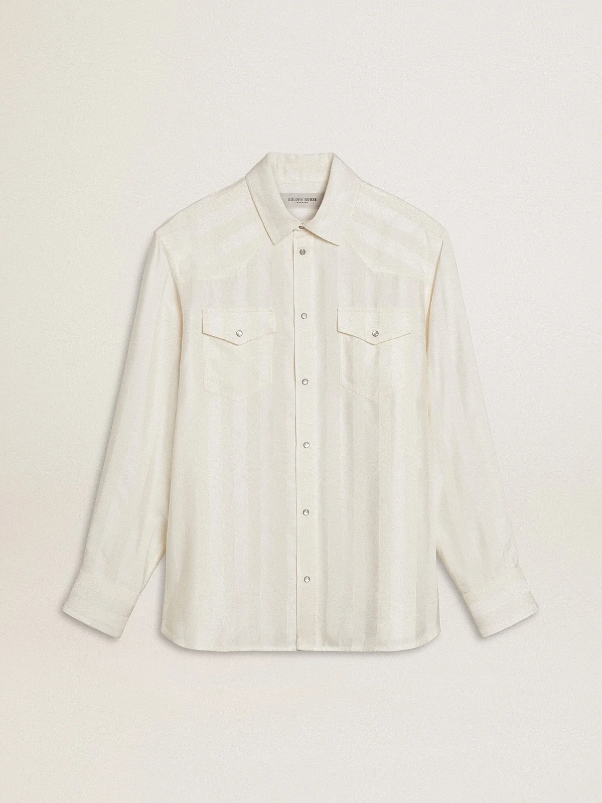 Inspired by the electric energy of the Nineties, the collection celebrates the limitless power of shared dreams. Moved by passion, each design captures the meaning of togetherness and the power of music. In white viscose, this oversized fit shirt features vertical cotton stripes and two front pockets. The five snap button closure adds the finishing touch. DETAILS Item No. GMP02252.P001877.20103 - Journey Collection - Color: white - Oversized fit - Double star on the back - Two front pockets - Tone-on-tone vertical stripes - Snap button closure - Main material: 96% viscose, 4% cotton - Made in Italy The model is 183 cm tall and is wearing a size M.