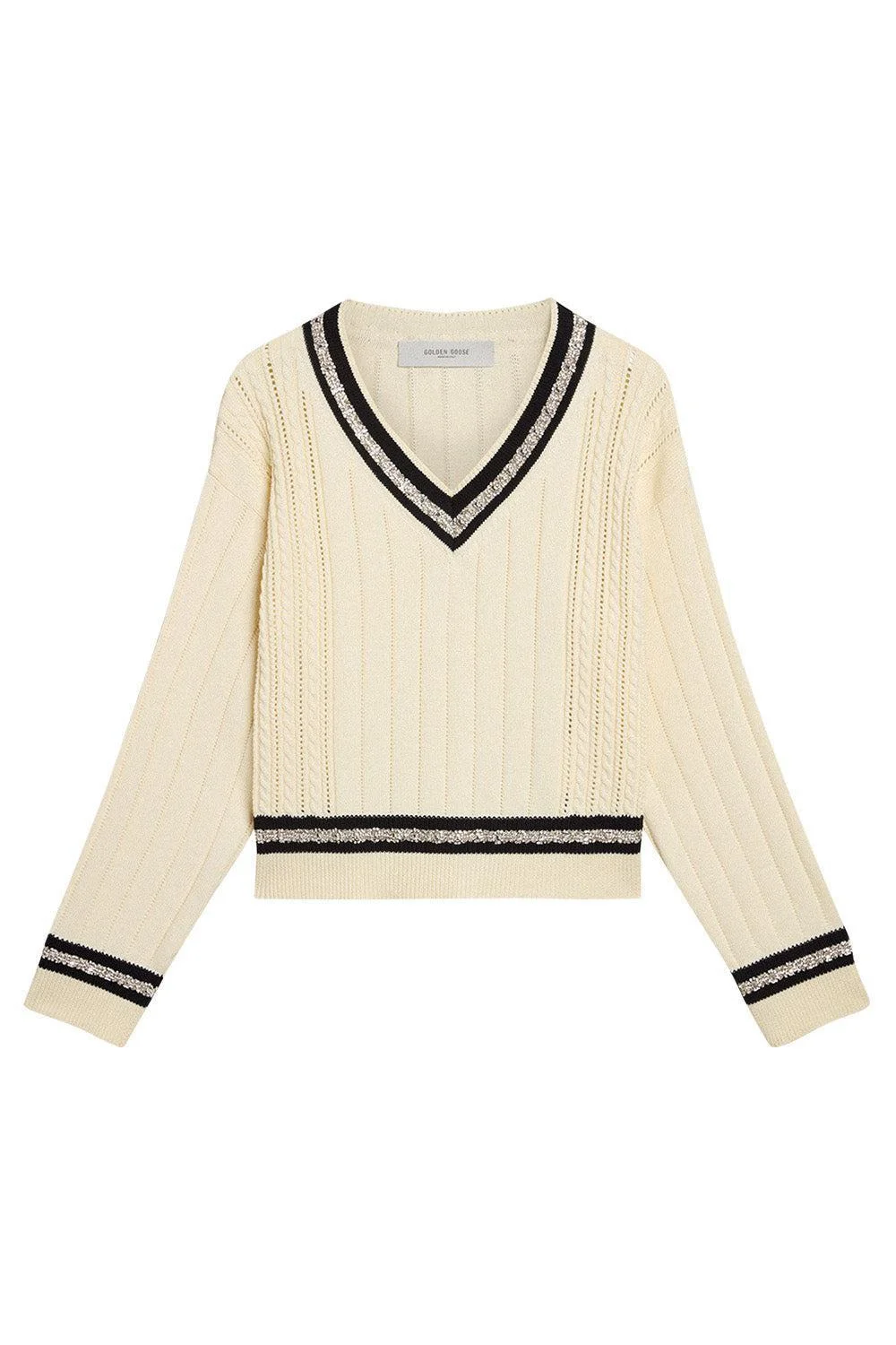 DETAILS AND INSIGHT Golden Goose golden w's marla vneck in heritage white/dark blue. Cotton Dry clean Made in Italy Style GWP02120.P001912.11782