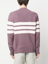 ribbed-knit crew neck sweatshirt amaranth purple white ribbed knit logo patch at the chest horizontal stripe pattern round neck long sleeves ribbed cuffs and hem Made in Italy Composition Polyester 100%, Linen/Flax 80%, Polyamide 15%, Elastane 5% SIZE & FIT Model measurements Height 6 ft 2 in(1.87 m) Bust/Chest 35.82 in(91 cm) Hips 35.43 in(90 cm) Waist 27.95 in(71 cm) FittingInformation This piece fits true to size. We recommend you get your regular size Cut for a loose fit Made with a mid-weight fabric Washing instructions Hand Wash