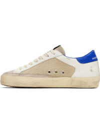 Handcrafted low-top buffed leather, suede, and mesh sneakers in beige and off-white. · Smudging and subtle distressing throughout · Lace-up closure · Logo flag at tongue · Padded collar · Eyelets at sides · Signature star applique at outer side · Logo patch and printed logo at outer side · Logo printed at croc-embossed leather heel tab · Jersey and terrycloth lining · Treaded rubber sole Supplier color: Latte/White/Bluette Upper: leather, textile. Sole: rubber. Made in Italy 251264M237076