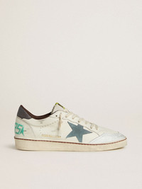Dreaming of the Eighties. Our Ball Star sneakers have an American college vibe caught between a hoop shot and a skateboard ride. This men's model with a white leather upper features a powder-blue suede star and a dark brown nubuck heel tab. The white crackle suede toe and white laces add the finishing touch: beautiful things that never go out of fashion. DETAILS Item No. GMF00915.F007926.12359 - Color: white - Powder-blue suede star - Dark brown nubuck heel tab - White crackle suede toe - Brown stripe - White laces - Vintage finish - Upper: 92% cow leather, 8% polyamide - Lining: 34% cotton, 31% cow leather, 25% polyester, 7% textile polyurethane, 3% spandex - Sole: 100% rubber - Handmade - Made in Italy