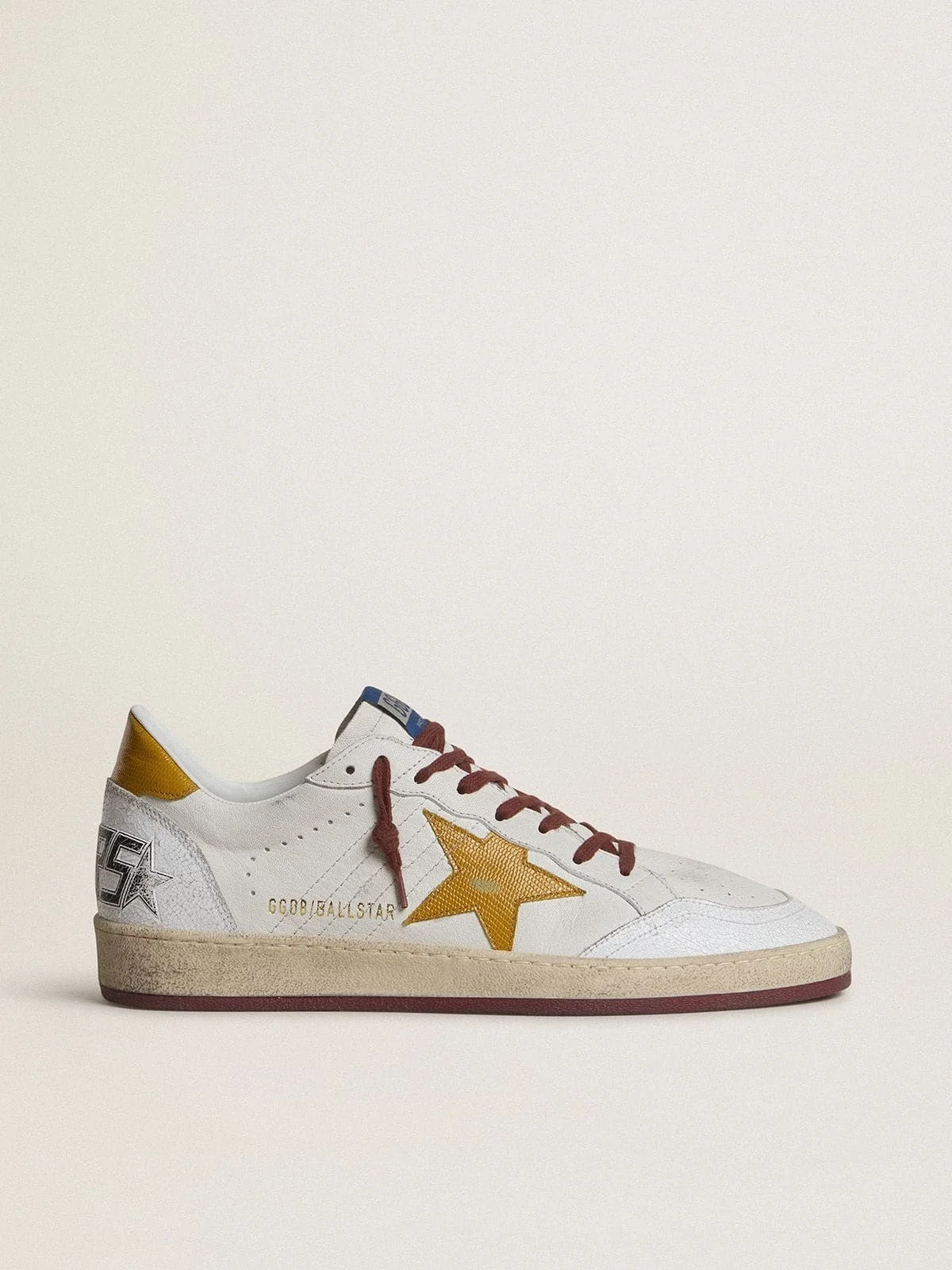 Dreaming of the Eighties. Our Ball Star sneakers have an American college vibe caught between a hoop shot and a skateboard ride. This model with a white nappa leather upper features a yellow animal-print leather star and heel tab. The white crackle leather inserts on the toe and back and burgundy laces add the finishing touch: beautiful things that never go out of fashion. DETAILS Item No. GMF00117.F007352.10356 - White nappa leather upper - Yellow leather star with animal-print motif - Yellow leather heel tab with animal-print motif - Sneakers lettering on the heel in a black heavy metal font - White crackle leather inserts - Burgundy laces - Vintage finish - Upper: 71% sheepskin leather, 29% cow leather - Lining: 34% cotton, 31% cow leather, 23% textile polyurethane, 8% viscose, 4% polyester - Sole: 100% rubber - Handmade - Made in Italy