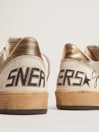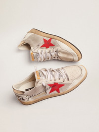 Dreaming of the Eighties. Our Ball Star sneakers have an American college vibe and a feeling of the basketball scene around at the time. This model, with a light silver mesh upper accentuated by white crackle leather inserts, features a red leather star and a platinum-colored laminated leather heel tab. The black Golden Goose lettering screen-printed on the upper and the white laces with contrasting black logo add the finishing touch: beautiful things that never go out of fashion. DETAILS Item No. GMF00117.F002606.70214 - Light silver mesh upper - Red leather star - Platinum laminated leather heel tab - White crackle leather toe cap - White crackle leather insert on the rear - White leather tongue and toe - Black screen-printed Golden Goose lettering - White laces with contrasting black logo - Vintage finish - Upper: 51% polyester, 26% cow leather, 23% sheepskin leather - Lining: 64% cow leather, 36% cotton - Sole: 100% rubber - Made in Italy - Handcrafted