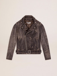 A unique, timeless collection that encapsulates the Golden Goose DNA, designed to remain with you every day, through thick and thin, come rain or shine. Made of our traditional bull leather, this regular-fit men’s biker jacket features a distressed treatment. The animal-print lining adds the finishing touch. DETAILS Item No. GMP00297.P000647.90100 - Color: black - Animal-print lining - Double gold star on the back - Regular fit - Four front pockets - Belt with buckle - Long sleeves - Zip fastening - Distressed treatment - Main material: 100% cow leather - Lining: 100% polyester - Sleeve lining: 100% polyester - Made in Italy The model is 183 cm tall and is wearing a size 48.