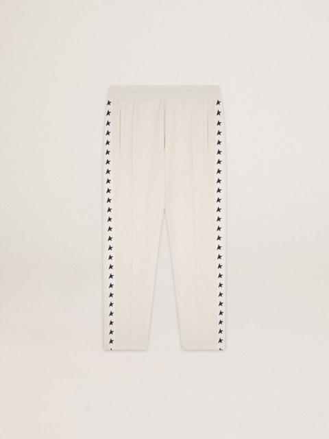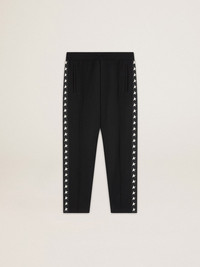 A collection with a casual soul but a versatile attitude: inspired by the Seventies, it has a timeless vintage appeal, suited to any occasion or look. Inspired by the world of tailoring, echoed by the stitched pleat on the front, these joggers in black technical jersey feature a wide leg. The tone-on-tone grosgrain strip on the sides of the legs with contrasting white stars adds the finishing touch. DETAILS Item No. GMP00877.P000521.80203 - Star Collection - Color: black - Wide leg - Three pockets - Grosgrain strip on the sides with contrasting white stars - Main material: 100% polyester - Pocket lining: 100% cotton - Made in Italy The model is 183 cm tall and is wearing a size M.