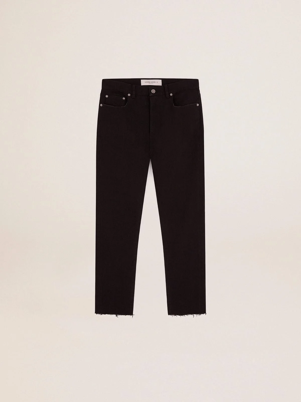 A unique, timeless collection that encapsulates the Golden Goose DNA, designed to remain with you every day, through thick and thin, come rain or shine. These men’s black jeans have a skinny fit and raw cut edges on the hem of the leg. The detachable white patch with a finely embroidered letter G in red adds the finishing touch. DETAILS Item No. GMP00290.P000622.90100 - Color: black - Double gold star on the back - Detachable white patch with embroidered red letter G - Skinny fit - Five pockets - Main material: 98% cotton, 2% spandex - Pocket lining: 65% polyester, 35% cotton - Made in Italy The model is 183 cm tall and is wearing a size 32 (IT).