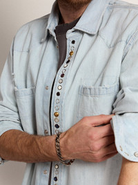 A unique, timeless collection that encompasses the essence of Golden Goose, designed to remain with you every day and accompany your highs and lows, come rain or shine. In bleached cotton with a distressed treatment, this regular-fit shirt features hammered studs and a detachable white patch with a finely embroidered letter G in red. DETAILS Item No. GMP00487.P000636.50100 - Color: bleached blue - Hammered studs - Double gold star on the back - Detachable white patch with embroidered red letter G - Regular fit - Long sleeves - Two front pockets - Distressed treatment - Main material: 100% cotton - Made in Italy The model is 183 cm tall and is wearing a size M.