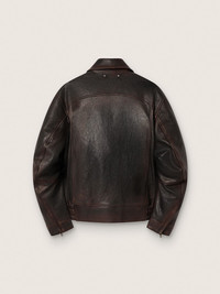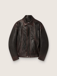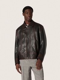 The third drop in our Fall/Winter 25 collection channels the funky glamor of the 1970s, a time when the night transformed into a canvas for unapologetic self-expression. This regular-fit men's bomber jacket in soft burgundy nappa leather features a zip closure with two logo buttons, a zip detail on the sleeves and tone-on-tone piping. The iconic stars applied on the back and the handcrafted lived-in finish that makes the garment unique complete the look. DETAILS Item No. GMP02531.P002301.40249 - Journey Collection - Color: burgundy - Men’s bomber jacket - Regular fit - Nappa leather model - Pointed collar - Zip detail on the hem of the sleeves - Elasticated waistband detail - Handcrafted finish with a lived-in look - Front fastening with hidden zip and two logo buttons - Double star on the back - Silver-colored inner chain - Tone-on-tone piping - Main material: 100% sheepskin leather - Lining: 100% viscose - Pocket lining: 100% cotton - Made in Italy The model is 183 cm tall and is wearing a size M.