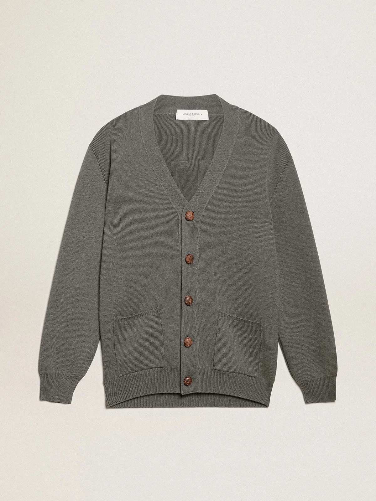 A unique, timeless collection that encapsulates the Golden Goose DNA, designed to remain with you every day, through thick and thin, come rain or shine. This regular-fit men’s cardigan in dark gray melange cotton features a contrasting white logo on the back and brown leather buttons. The detachable white patch with a finely embroidered letter G in red adds the finishing touch. DETAILS Item No. GMP00946.P000662.60304 - Color: dark gray melange - Contrasting white logo on the back - Double gold star on the back - Detachable white patch with embroidered red letter G - Fastening with brown leather buttons - Regular fit - Long sleeves - Main material: 96% cotton, 3% polyamide, 1% spandex - Made in Italy The model is 183 cm tall and is wearing a size M.