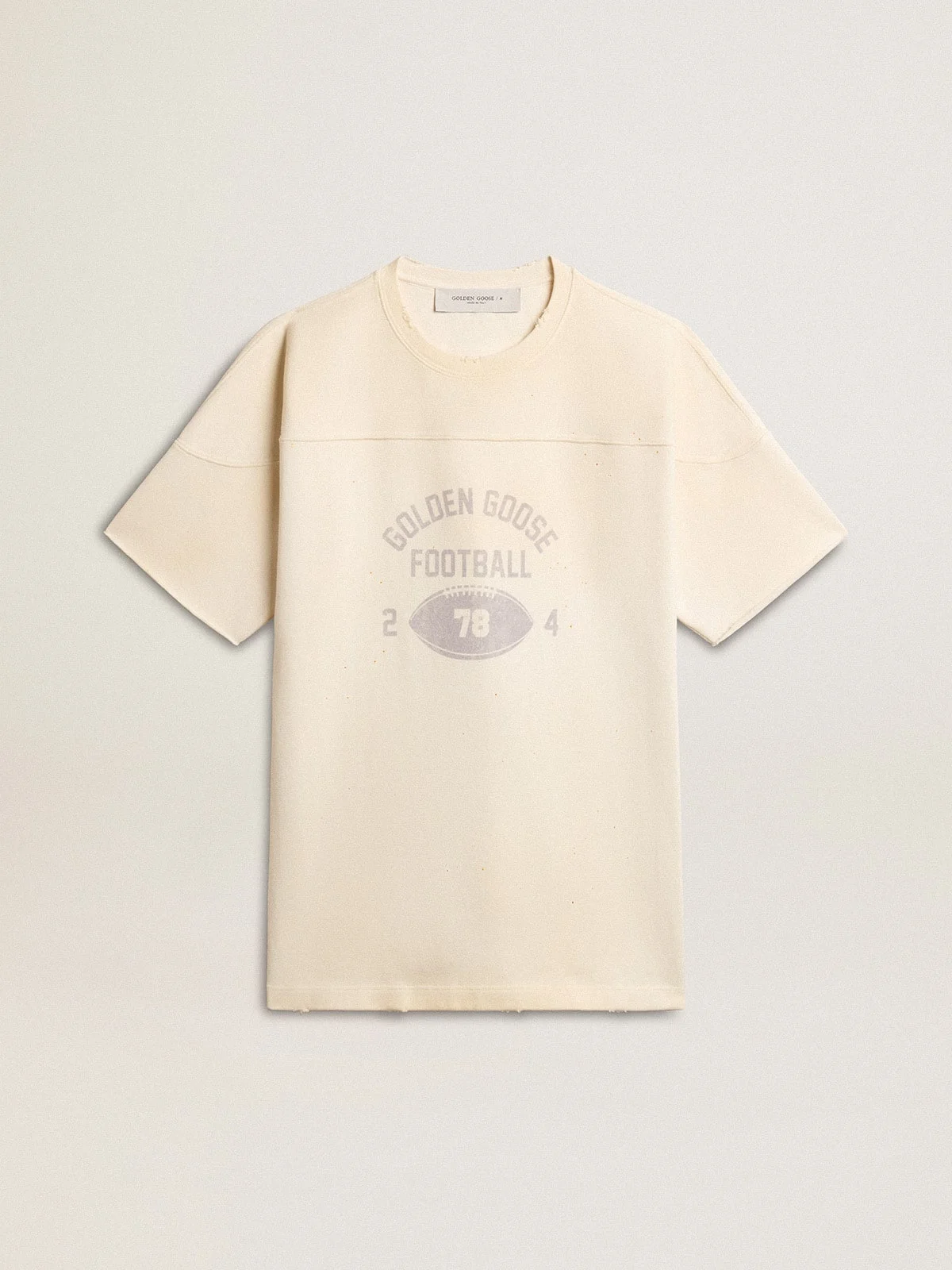 A love story to our home, Marghera. Where everything began. Our latest collection reflects the spirit of our birthplace, its contrasts, industrial soul, and manufacturing landscapes, weaving together inspirations from both the vibrant energy of workwear and the refined essence of traditional tailoring. In aged white cotton jersey, this men's T-shirt features a raw-cut edge on the chest, shoulder and sleeves that divides the garment into two parts. The finishing touch is the vintage-effect print on the front and the worn details on the neck, edges and sleeves that give a lived-in effect to the garment. DETAILS Item No. GMP01936.P001641.11421 - Journey Collection - Color: aged white - Double star on the back - Regular fit - Lived-in effect - Vintage watercolor print - Raw cut on the front - Main material: 100% cotton - Made in Italy The model is 183 cm tall and is wearing a size M.