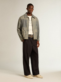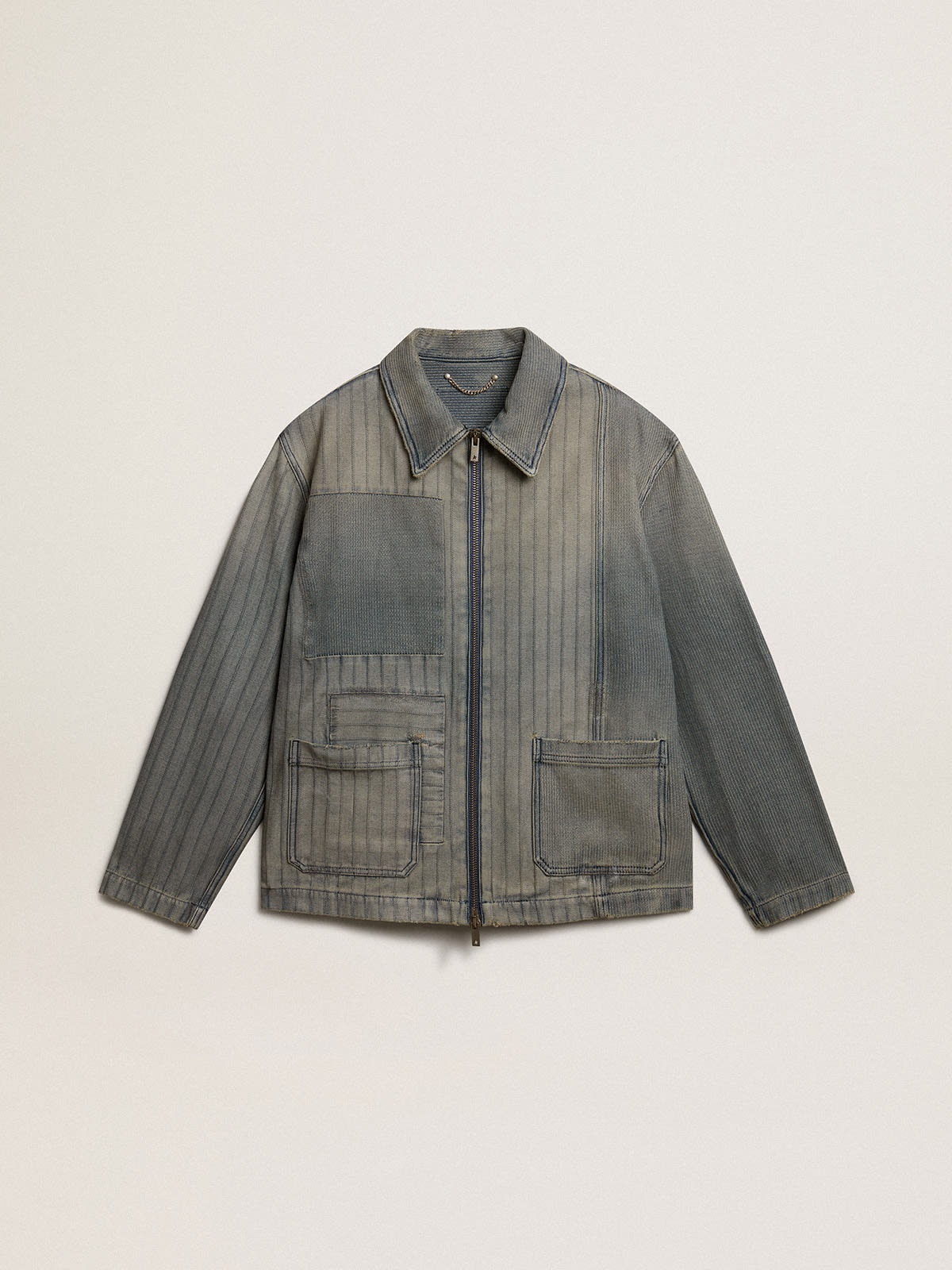 From Venice, our home, to Paris, our dream. This Journey Collection captures the essence and beauty of everyday moments in the City of Lights, immersed in a mesmerizing atmosphere where intimacy, authenticity and curiosity are the pulsating soul of it. This cotton denim zip-up jacket features a heavily distressed finish. The stripes and patches make this jacket a true one-of-a-kind. DETAILS Item No. GMP01778.P001474.60100 - Journey Collection - Color: gray denim - Double star on the back - Regular fit - Two front pockets - Distressed finish - Zip fastening - Main material: 100% cotton - Contrasting material: 100% cotton - Made in Italy The model is 183 cm tall and is wearing a size M.