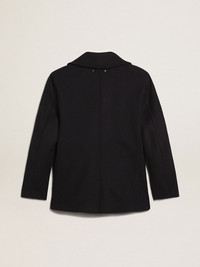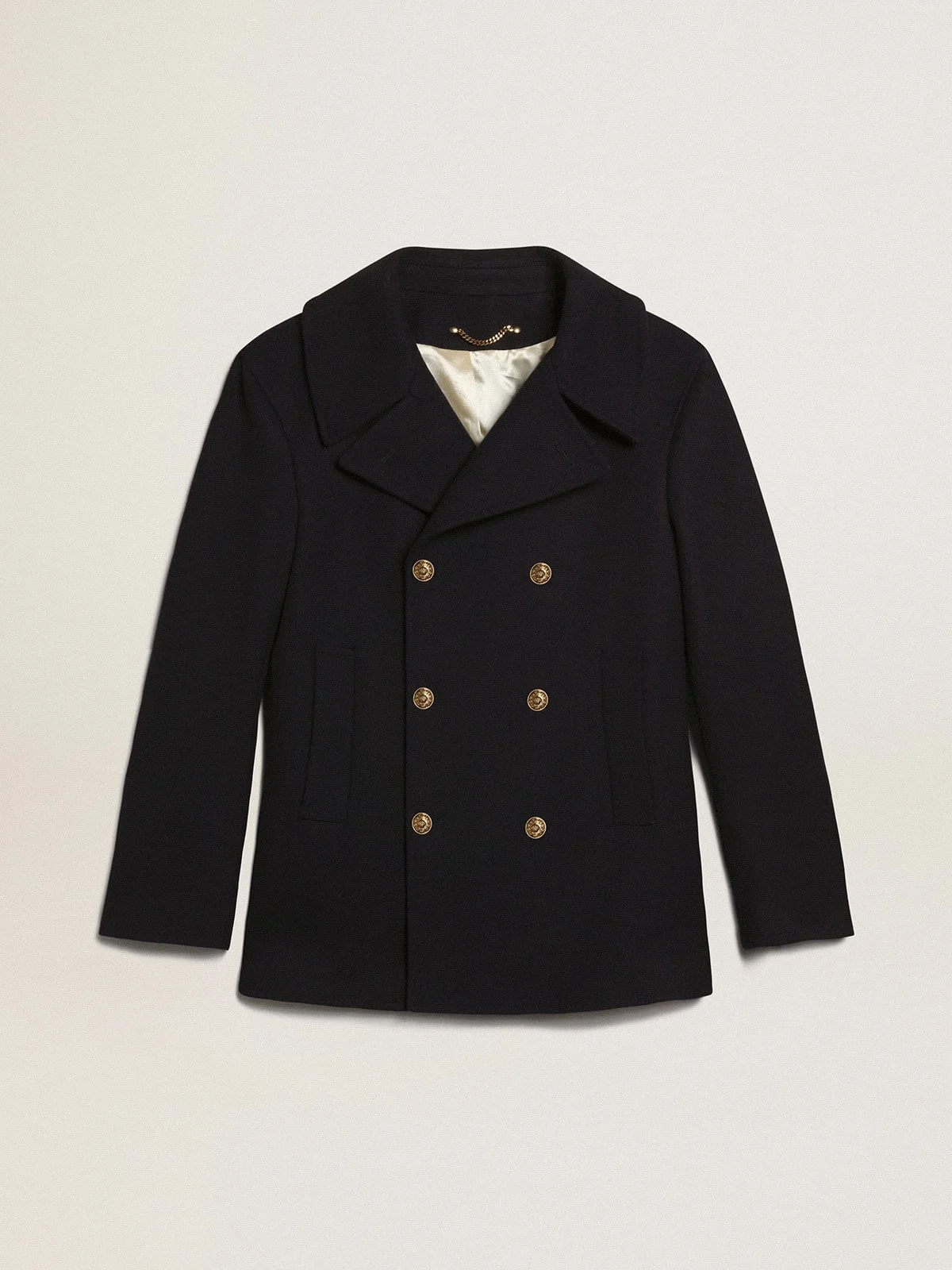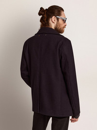 A unique, timeless collection that encapsulates the Golden Goose DNA, designed to remain with you every day, through thick and thin, come rain or shine. This men’s regular-fit double-breasted peacoat in dark blue wool features a fastening with gold-colored heraldic buttons and a detachable white patch with a finely embroidered letter G in red. DETAILS Item No. GMP01075.P000618.50486 - Color: dark blue - Double-breasted model - Double gold star on the back - Detachable white patch with embroidered red letter G - Two front pockets - Long sleeves - Fastening with gold-colored heraldic buttons - Main material: 80% virgin wool, 20% polyamide - Lining: 64% viscose, 36% rayon - Sleeve lining: 52% viscose, 48% acetate - Made in Italy The model is 183 cm tall and is wearing a size 48.
