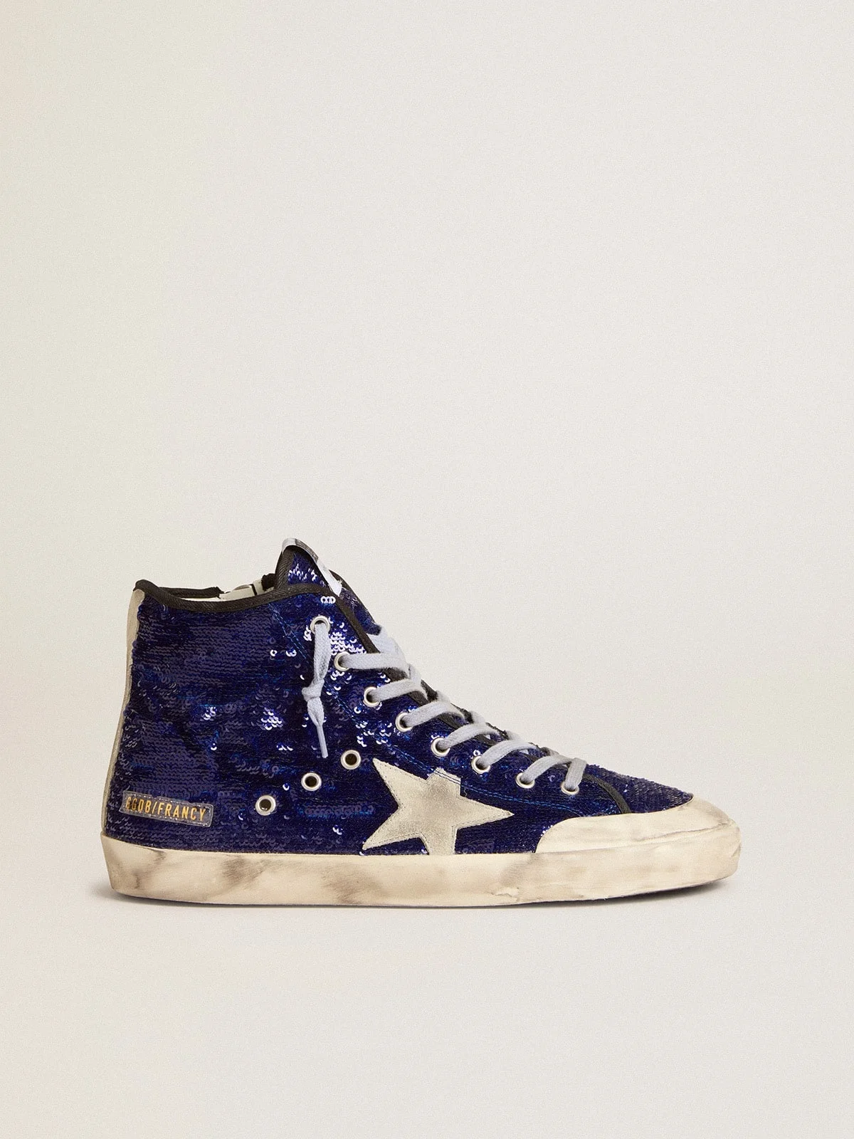 The Seventies, today: inspired by the world of basketball, the style of the Francy sneakers is updated with unexpected details and special finishes. These men’s sneakers with a bright blue sequin upper feature an ice-gray suede star and heel tab. The beige rubber toe, black cotton trim and light blue laces complete the look. DETAILS Item No. GMF00114.F005512.50588 - Bright blue sequin upper - Ice-gray suede star - Ice-gray suede heel tab - Beige rubber toe - Black cotton trim - Light blue laces - Vintage finish - Upper: 52% polyester, 33% cotton, 8% nylon, 7% cow leather - Lining: 57% cotton, 26% cow leather, 10% textile polyurethane, 5% polyester, 2% viscose - Sole: 100% rubber - Handmade - Made in Italy
