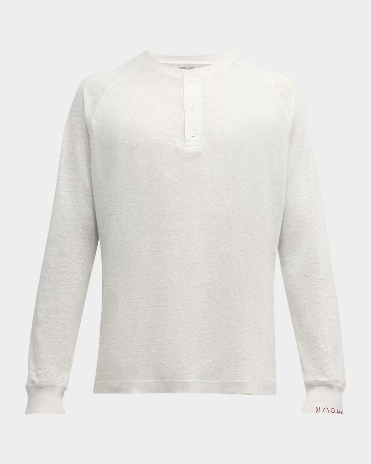 - Golden Goose "Journey" T-shirt in solid linen - Henley neckline - Long raglan sleeves - "Amour" embroidery at left cuff - Pullover style - Made in Italy - Model is 6'1"/185cm.