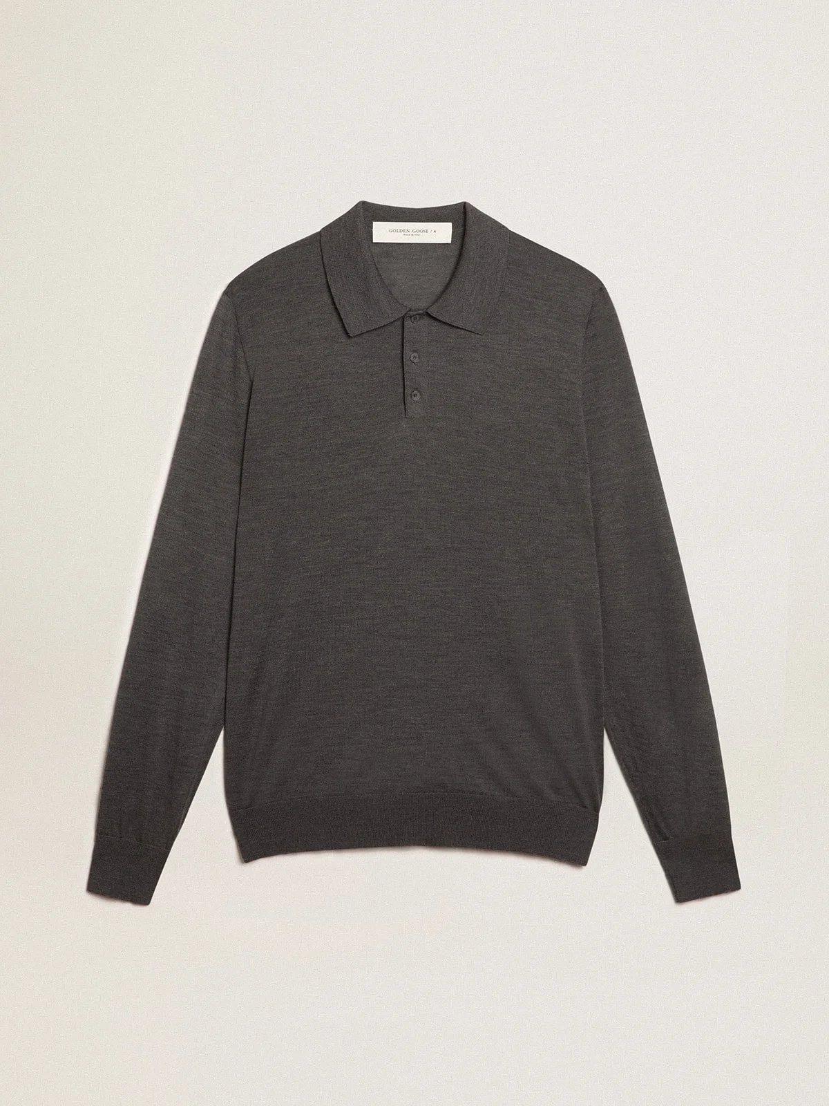 A unique, timeless collection that encapsulates the Golden Goose DNA, designed to remain with you every day, through thick and thin, come rain or shine. This men’s polo shirt in anthracite-gray merino wool features long sleeves and four central buttons. The detachable white patch with a finely embroidered letter G in red adds the finishing touch. DETAILS Item No. GMP01353.P001041.60318 - Golden Collection - Color: anthracite gray - Four central buttons - Long sleeves - Regular fit - Detachable white patch with embroidered red letter G - Double star on the back - Main material: 100% wool - Made in Italy The model is 183 cm tall and is wearing a size M.