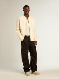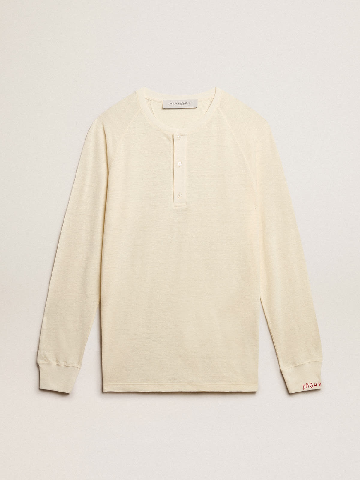 From Venice, our home, to Paris, our dream. This Journey Collection captures the essence and beauty of everyday moments in the City of Lights, immersed in a mesmerizing atmosphere where intimacy, authenticity and curiosity are the pulsating soul of it. This regular-fit T-shirt in panama-colored linen slub jersey features long sleeves and a mother-of-pearl button fastening. The “Amour” lettering embroidered on the left cuff adds the finishing touch. DETAILS Item No. GMP01649.P001407.11560 - Journey Collection - Color: panama - Double gold star on the back - Long raglan sleeves - Fastening with mother-of-pearl buttons - Red “Amour” lettering embroidered on the left cuff - Main material: 100% linen - Contrasting material: 100% cotton - Made in Italy The model is 183 cm tall and is wearing a size M.