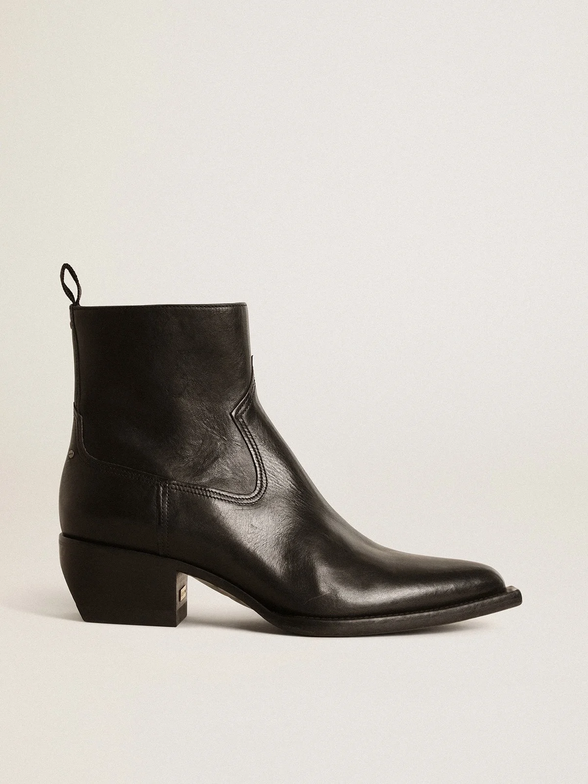Rock soul and timeless style: the pointed toe, slim fit and minimal design of the Debbie ankle boot make it perfect for any occasion. In this low men’s version, these boots feature a black leather upper with tone-on-tone stitching and a zip fastening on the side. The metal stud detail and gold-colored metal plaque engraved with the Golden Goose signature on the heel complete the look. DETAILS Item No. GMF00545.F004488.90100 - Color: black - Zip fastening on the side - Tone-on-tone stitching - Metal studs on the back - Gold-colored metal plaque engraved with the Golden Goose signature on the heel - Heel height: 4.5 cm - Leg height: 15 cm - Upper: 100% cow leather - Lining: 100% cow leather - Sole: 100% cow leather