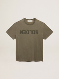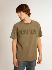 A unique, timeless collection that encapsulates the Golden Goose DNA, designed to remain with you every day, through thick and thin, come rain or shine. This round-neck, regular-fit T-shirt in olive-green pure cotton features a distressed effect and tone-on-tone Golden lettering on the front. The detachable white patch with a finely embroidered letter G in red adds the finishing touch. DETAILS Item No. GMP01220.P000671.35479 - Color: olive green - Tone-on-tone Golden lettering on the front - Distressed effect - Detachable white patch with embroidered red letter G - Double gold star on the back - Round neck - Short sleeves - Regular fit - Main material: 100% cotton - Rib material: 100% cotton The model is 183 cm tall and is wearing a size M.