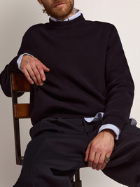 A unique, timeless collection that encapsulates the Golden Goose DNA, designed to remain with you every day, through thick and thin, come rain or shine. In dark blue cotton, this regular-fit round-neck sweater features a contrasting white logo on the back and a detachable white patch with a finely embroidered letter G in red. DETAILS Item No. GMP00841.P000662.50486 - Color: dark blue - Contrasting white logo on the back - Double gold star on the back - Detachable white patch with embroidered red letter G - Regular fit - Long sleeves - Main material: 96% cotton, 3% polyamide, 1% spandex - Made in Italy The model is 183 cm tall and is wearing a size M.