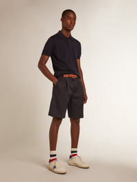 A unique, timeless collection that encapsulates the Golden Goose DNA, designed to remain with you every day, through thick and thin, come rain or shine. This men’s polo shirt in navy-blue merino wool features short sleeves and four central buttons. The detachable white patch with a finely embroidered letter G in red adds the finishing touch. DETAILS Item No. GMP01412.P001041.50501 - Golden Collection - Color: navy blue - Four central buttons - Short sleeves - Regular fit - Detachable white patch with embroidered red letter G - Double star on the back - Main material: 100% wool - Made in Italy The model is 183 cm tall and is wearing a size M.