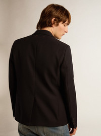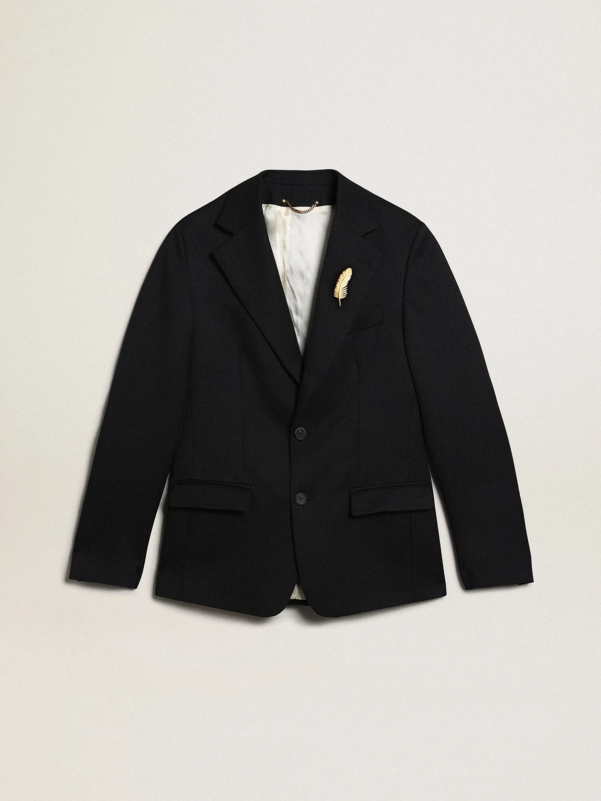 A unique, timeless collection that encapsulates the Golden Goose DNA, designed to remain with you every day, through thick and thin, come rain or shine. In dark blue wool gabardine, this slim-fit single-breasted men’s blazer features three front pockets. The detachable white patch with a finely embroidered letter G in red adds the finishing touch. DETAILS Item No. GMP00855.P000619.50486 - Golden Collection - Color: dark blue - Double gold star on the back - Single-breasted style - Slim fit - Three front pockets - Button fastening - Main material: 66% polyester, 34% virgin wool - Undercollar: 100% polyester - Lining: 64% viscose, 36% cupro - Sleeve lining: 52% viscose, 48% acetate - Made in Italy The model is 183 cm tall and is wearing a size M.