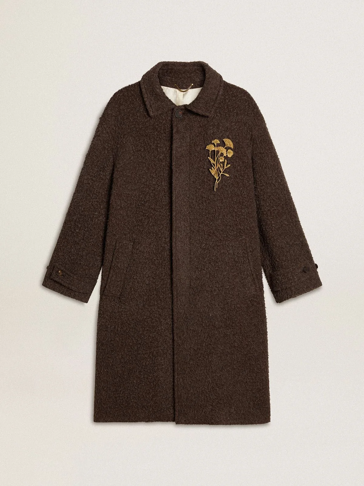 A collection created to be by your side at all times, ready to accompany you on bright days and unforgettable adventures. A contemporary take on a great classic, this men's single-breasted coat features a dark brown wool blend fabric with a wrinkle effect and an elegant bronze-toned floral pin on the chest. DETAILS Item No. GMP02344.P002260.60184 - Journey Collection - Color: dark brown - Single-breasted cut - Wool blend fabric with wrinkle effect - Bronze-colored flower-shaped decorative pin attached to the chest - Front button fastening - Main material: 50% virgin wool, 33% mohair, 17% polyamide - Lining: 100% viscose - Pin material: 100% brass - Handmade - Made in Italy