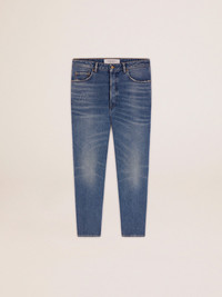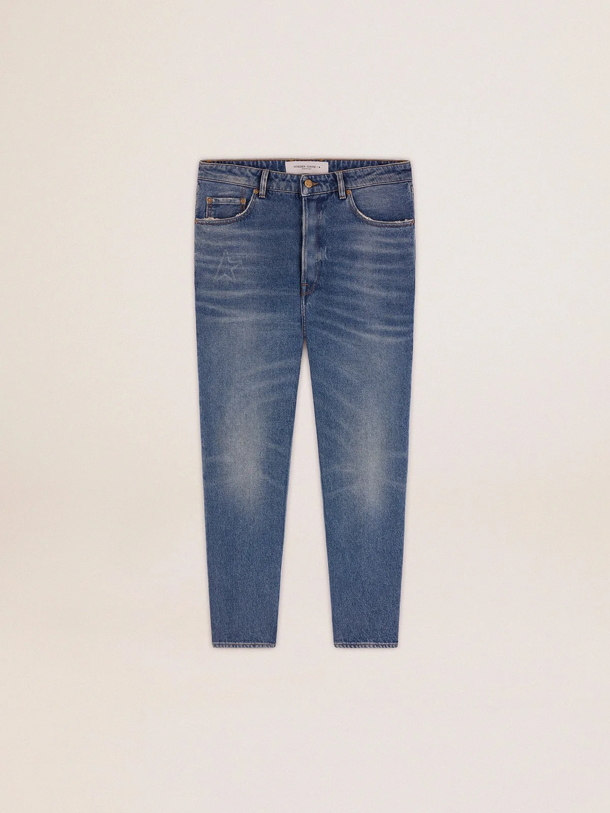 A unique, timeless collection that encompasses the essence of Golden Goose, designed to remain with you every day and accompany your highs and lows, come rain or shine. These medium-wash jeans have a slim fit and a detachable white patch with a finely embroidered letter G in red. DETAILS Item No. GMP00596.P000621.50100 - Color: blue - Double gold star on the back - Detachable white patch with embroidered red letter G - Slim fit - Five pockets - Main material: 100% cotton - Pocket lining: 65% polyester, 35% cotton - Made in Italy The model is 183 cm tall and is wearing a size 32 (IT).