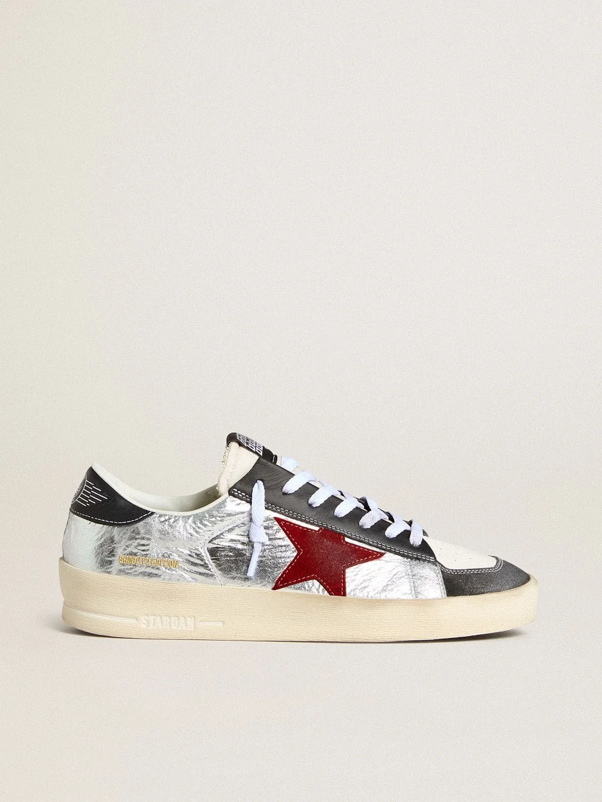 The glorious Nineties wrapped up in a sneaker. The Stardan sneakers pay homage to the basketball icons of that decade, while keeping an eye on the present. This version with a silver laminated nylon upper and black leather inserts features a burgundy suede star and black leather heel tab. And white laces add the finishing touch. DETAILS Item No. GMF00932.F007362.70328 - Silver laminated nylon upper with black leather inserts - Burgundy suede star - Black leather heel tab - White laces - Vintage finish - Upper: 42% cow leather, 38% polyamide, 10% textile polyurethane, 10% polyester - Lining: 42% cotton, 25% cow leather, 22% textile polyurethane, 6% viscose, 5% polyester - Sole: 100% rubber - Handmade - Made in Italy