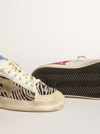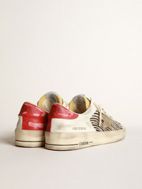 The glorious Nineties wrapped up in a sneaker. The Stardan sneakers pay homage to the basketball icons of that decade, while keeping an eye on the present. These limited edition, numbered men’s LAB sneakers feature a zebra-print pony skin and white leather upper with an ice-gray suede star and red leather heel tab. And cream-colored laces add the finishing touch. DETAILS Item No. GMF00128.F003533.81867 - Zebra-print pony skin and white leather upper - Ice-gray suede star - Red leather heel tab - Cream laces - Vintage finish - Upper: 49% sheepskin leather, 29% cow leather, 12% acrylic, 8% polyurethane, 2% polyester - Lining: 60% cow leather, 40% cotton - Sole: 100% rubber