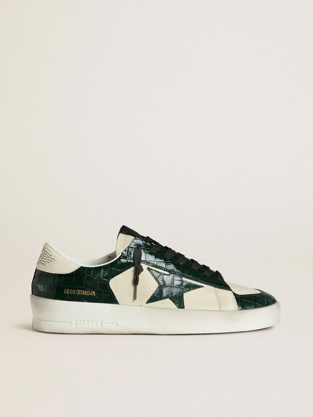 The glorious Nineties wrapped up in a sneaker. The Stardan sneakers pay homage to the basketball icons of that decade, while keeping an eye on the present. In this men's version, the cream-colored leather upper features a star and inserts in dark green crocodile-print leather. The cream-colored leather heel tab and dark green laces add the finishing touch. DETAILS Item No. GMF00667.F007885.35924 - Color: cream - Dark green crocodile-print leather star - Dark green crocodile-print leather inserts - Cream-colored leather heel tab - Dark green laces - Vintage finish - Upper: 100% cow leather - Lining: 40% cotton, 26% cow leather, 22% textile polyurethane, 6% polyester, 6% viscose - Sole: 100% rubber - Handmade - Made in Italy