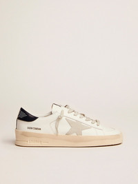 The glorious Nineties wrapped up in a sneaker. The Stardan sneakers pay homage to the basketball icons of that decade, while keeping an eye on the present. This version with white leather upper features an ice-gray suede star and glossy blue-navy heel tab. The asymmetrical glossy black leather insert on the back and ice-gray laces add the finishing touch. DETAILS Item No. GMF00128.F000567.10509 - Color: white - Ice-gray suede star - Glossy blue-navy leather heel tab - Asymmetrical glossy blue-navy leather insert on the back - Ice-gray laces - Vintage finish - Upper: 100% cow leather - Lining: 57% cow leather, 43% cotton - Sole: 100% rubber - Handmade - Made in Italy