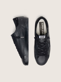 A timeless icon yet one that’s constantly evolving. At Golden, we love taking our classics and reworking them all the time, always from a new angle. These men's Super-Star with a total black effect feature a black suede star and heel tab on a black nappa leather upper. And black laces add the finishing touch. DETAILS Item No. GMF00101.F007991.90100 - Black nappa upper - Black suede star - Black suede heel tab - Black suede inserts - Black laces - Vintage finish - Upper: 100% cow leather - Lining: 33% cotton, 30% cow leather, 14% textile polyurethane, 10% sheepskin leather, 8% polyester, 5% viscose - Sole: 100% rubber - Handmade - Made in Italy